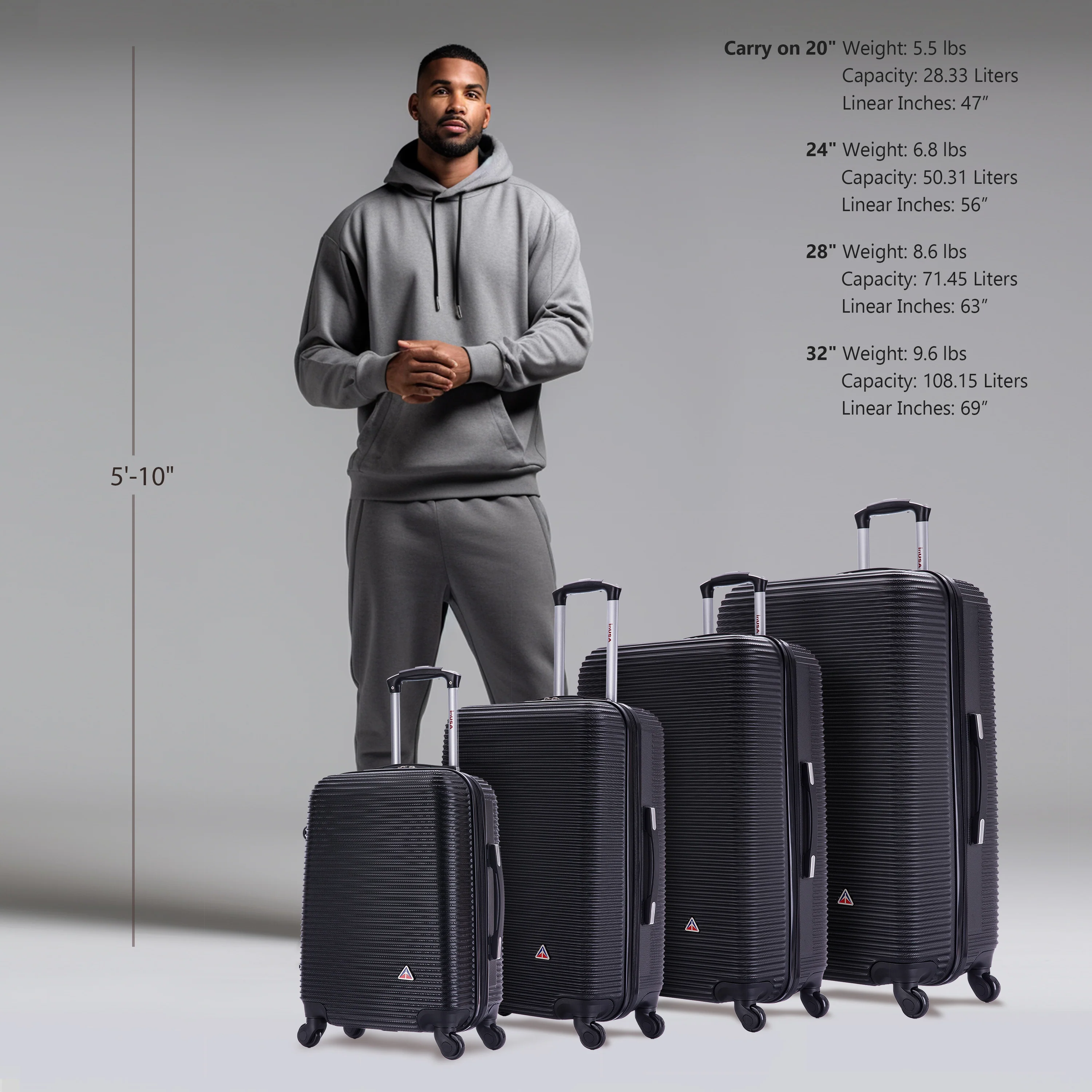 The InUSA Royal 4-Piece Luggage Set is stylish, durable, and functional. This set is perfect for all your travel needs with a Micro Diamond finish, full interior lining, four spinner wheels, and a retractable trolley system. Available in four sizes and is suitable for most airlines. Travel in style and comfort with InUSA.