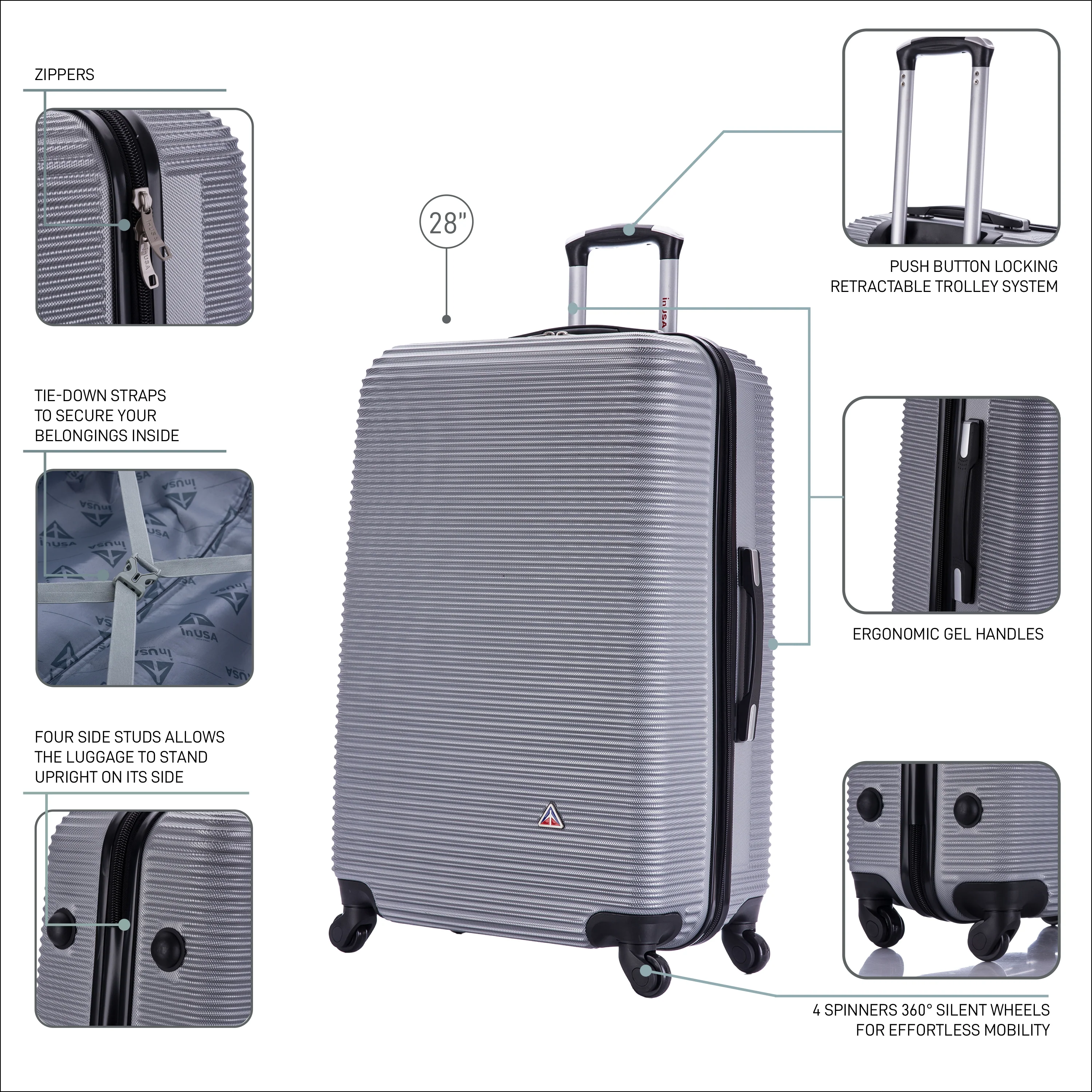 • Four spinner multi-directional silent 360° wheels for effortless mobility.
